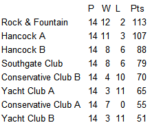 League Winners 91-92 MUMBLES CON CLUB A 92-93 ADMIRAL BENBOW 93-94 WILLIAM H/COCK A 94-95 SLT& SRC 95-96 WILLIAM H/COCK B 96-97 LYNDEN TREE A 97-98 MUMBLES CON CLUB 98-99 WILLIAM H/COCK A 99-00 MURTON ROVERS 00-01 THE GEORGE 01-02 MUMBLES PIER 02-03 WILLIAM H/COCK A 03-04 SOCIAL CLUB A 04-05 SOCIAL CLUB A 05-06 SOCIAL CLUB A 06-07 SOCIAL CLUB A 07-08 ROCK & FOUNTAIN B 08-09 ROCK & FOUNTAIN B 09-10 HANCOCK A 10-11 ROCK & FOUNTAIN A 11-12 ROCK & FOUNTAIN |